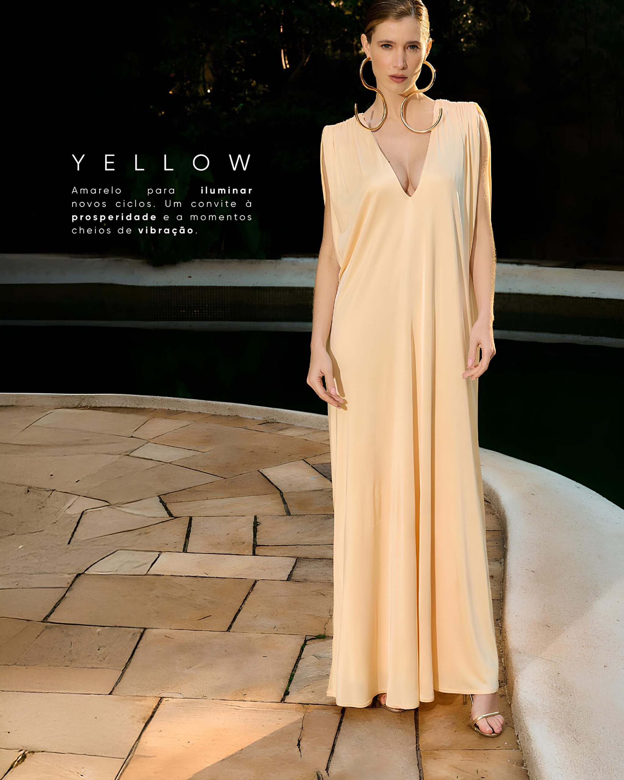 Look Anne Fernandes para usar o Amarelo no Ano Novo: Vestido Maxi Midi com Bababdos